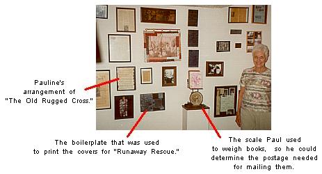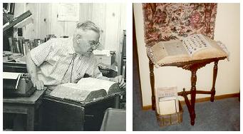 | In the Sugar Creek Gang books, the Collins family owned a big dictionary nicknamed "Aunt Miriam." Paul actually owned a similar dictionary. Below left, Paul working on a book and looking up a word in "Aunt Miriam." Below right, "Aunt Miriam" as she looks today, proudly displayed in Pauline's home. |