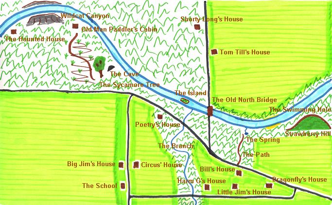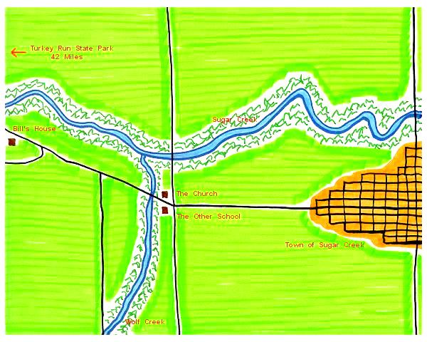 | Paul created a fictional landscape for the Sugar Creek Gang books based on the neighborhood in Indiana where he grew up. The locations of the gang member's houses seem to change some from book to book, but the map I have drawn below matches most of the descriptions. Click on the labels to see what the actual places look like today. |